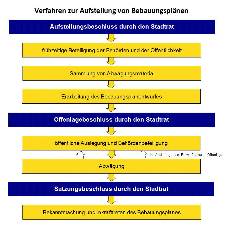 Auf dieser Seite finden Sie aktuelle Informationen zu allen in Aufstellung befindlichen Bauleitplänen. Die nachfolgende Grafik zeigt den schematischen Ablauf eines Bauleitplanverfahrens.