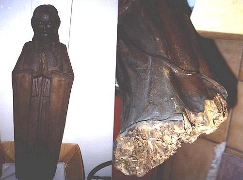 Das nicht mehr vorhandene Wetterschutzhäuschen sowie der durch Witterung und Schädlingsbefall stark beschädigte Fuß der Holzfigur verhinderten eine Wiederaufstellung.