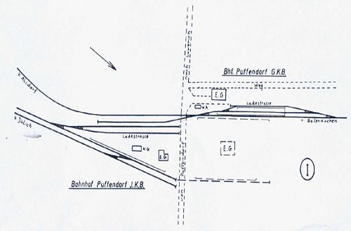 Die nachstehende Skizze zeigt die Lage der Gleisanlagen der JKB und der GKB in Puffendorf im Jahre 1939.Der gestrichelt dargestellte geplante Umbau der Gleisanlagen ist aufgrund der Kriegs- und Nachkriegsereignisse nicht ausgeführt worden.