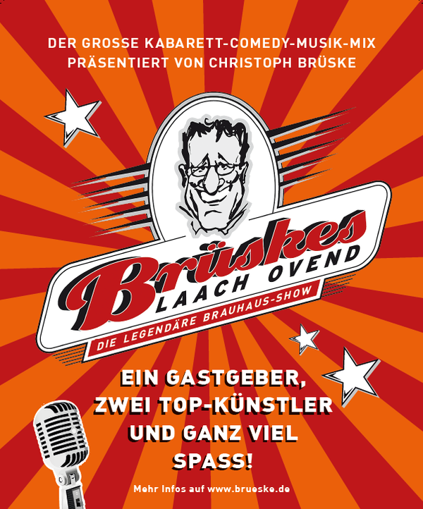 Seit vielen Jahren ist der Kabarettist mit seinen Soloprogrammen ein gern gesehener Gast in Baesweiler. Der dynamische Rheinländer hat sich aber auch als Veranstalter einen Namen gemacht. Seit 2004 präsentiert er im „Gasthaus Zur Linde“ in seiner Heimatstadt Niederkassel „Brüskes Laach Ovend“. In diesem Mixshow-Format lädt er zwei begnadete Gastkünstler ein und begeistert selbst mit aktuellen und lokalen Themen. Und das mit riesigem Erfolg: 125 Vorstellungen, alle ausverkauft und das bei wachsender Fangemeinde. Der „Laach Ovend“ hat sich damit zur erfolgreichsten Mixshow im Raum Bonn/Rhein-Sieg gemausert. Warum das so ist, davon kann sich das Publikum am 03.12.2026 auch in Baesweiler überzeugen. Aber anschnallen nicht vergessen: Es könnte an diesem Abend viel „gelaacht“ werden.