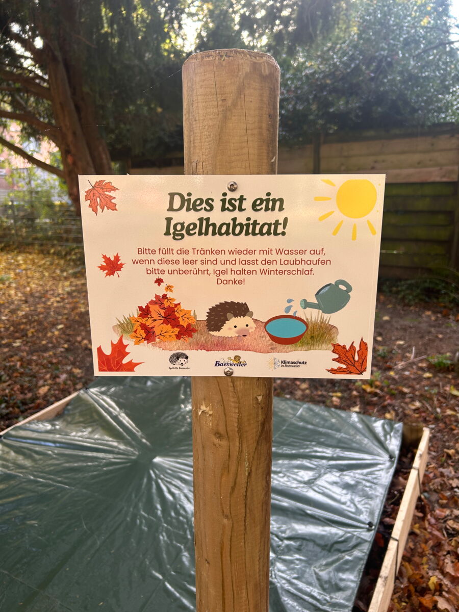 Wenn Sie ein solches Schild entdecken, wissen Sie, dass dort höchstwahrscheinlich ein oder mehrere Igel ihren Winterschlaf halten. Bitte stören Sie die Tiere nicht und lassen Sie die Habitate unberührt. - Sollte die Wassertränke einmal leer sein, dürfen Sie diese gerne vorsichtig mit stillem Wasser nachfüllen. So helfen Sie mit, dass die Igel gut durch den Winter kommen.