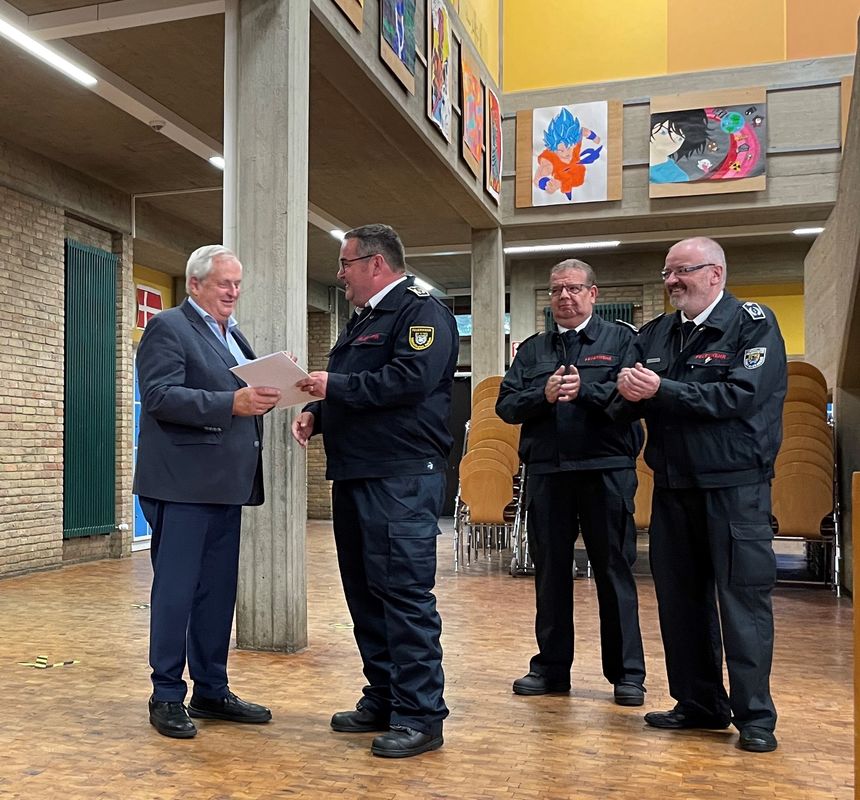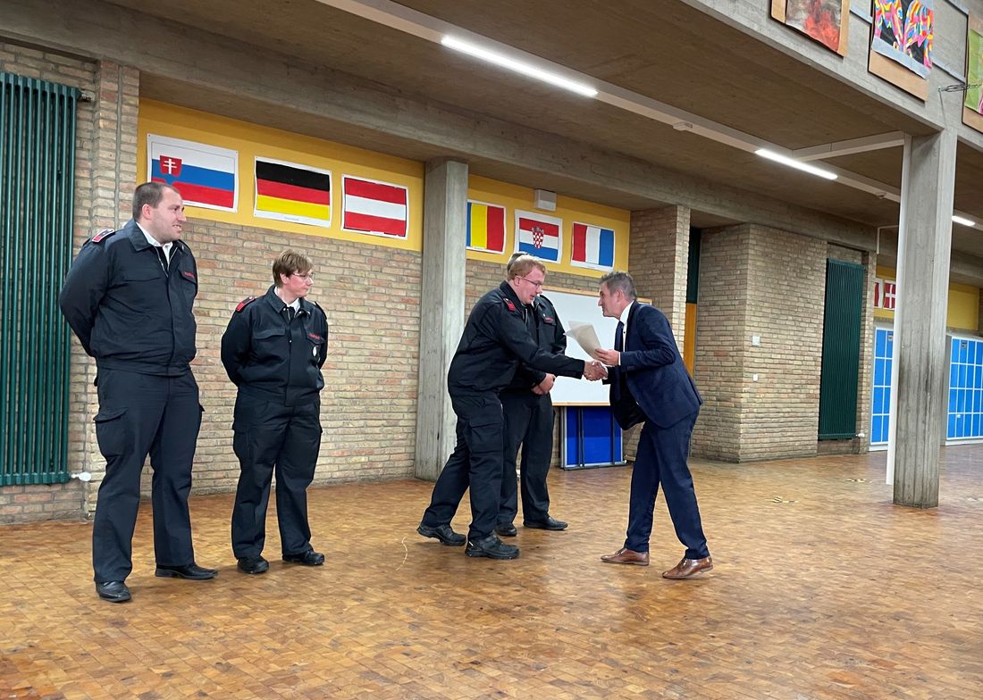 Des Weiteren ehrte der Kreisbrandmeister Feuerwehrmann Kevin Martin, Feuerwehrfrau Michele Mombartz, die Unterbrandmeister Florian Oberle und Michael Schöttl, Feuerwehrmann Luca Stramm, die Oberfeuerwehrmänner Thomas Kick, Hendrik Noculak und Marc Rudat, Feuerwehrmann Jonah Hilgers, Brandmeister Tim Hermanns, Unterbrandmeisterin Doris Dämmerich, Unterbrandmeister Tobias Breuer, Oberbrandmeister René Behla und Feuerwehrmann Samuel Grotthaus für ihre zehnjährige aktive Mitgliedschaft. Unterbrandmeister Ralf Breuer, Gerd Frings und Mario Josten sowie Brandoberinspektor Bernd Mertens, Brandamtsrat Thomas Sieprath, Brandinspektor Ralf Wenzel und Oberbrandmeister Marcus Noculak ehrte er für ihre 40-jährige aktive Mitgliedschaft in der Freiwilligen Feuerwehr Baesweiler und überreichte den Feuerwehrangehörigen eine Urkunde.