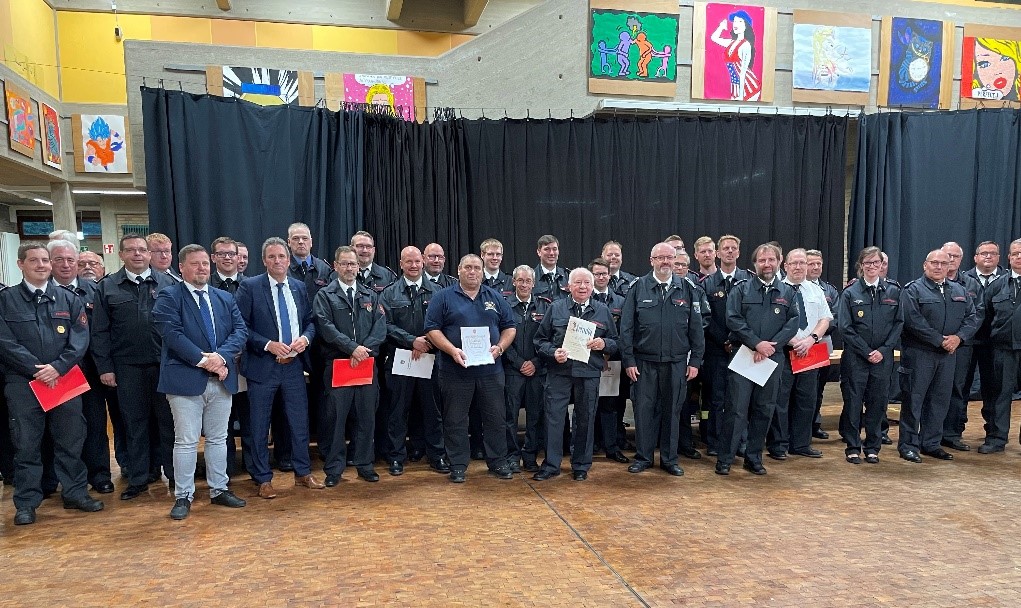 Auf Grund der Corona-Pandemie mussten die Versammlungen in 2020 und 2021 leider entfallen. Deshalb wurden diesmal Ehrungen und Beförderungen für die Jahre 2020, 2021 und 2022 durch Bürgermeister Pierre Froesch, Kreisbrandmeister Thomas Sprank und den Leiter der Feuerwehr, Dieter Kettenhofen, ausgesprochen.