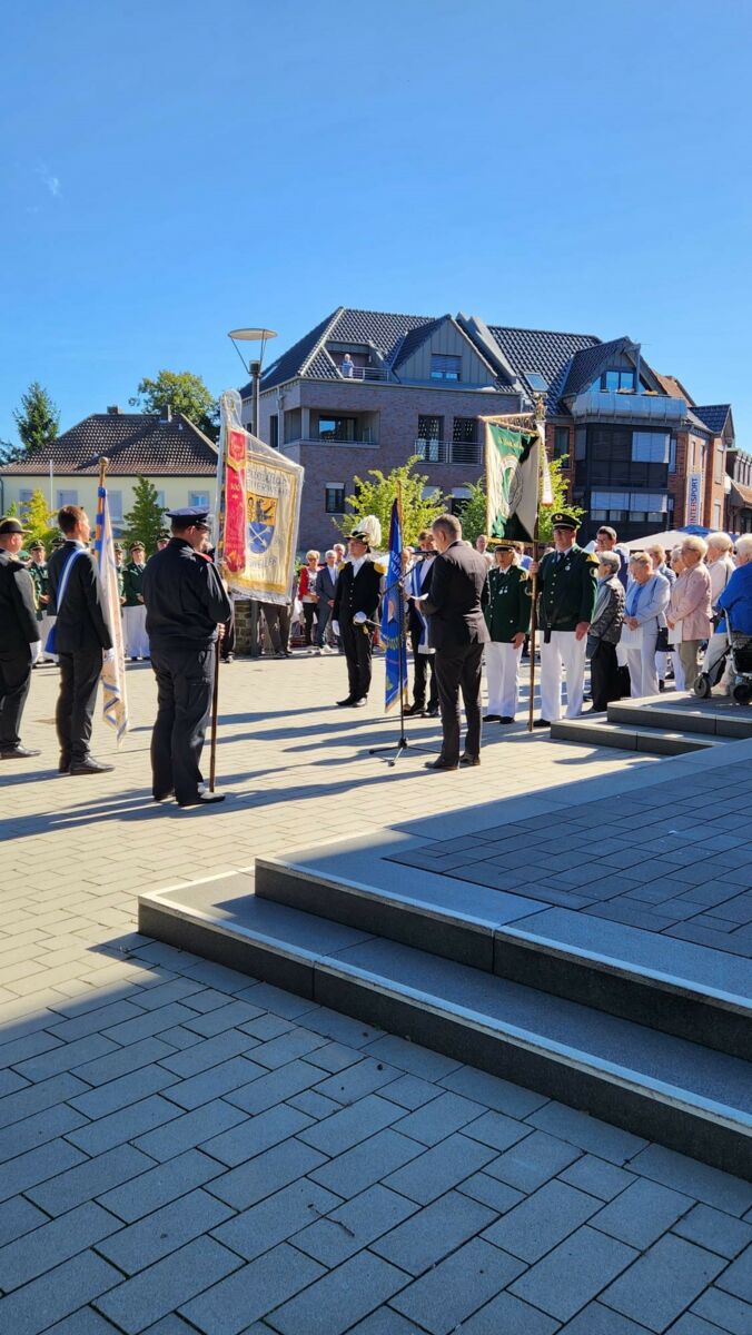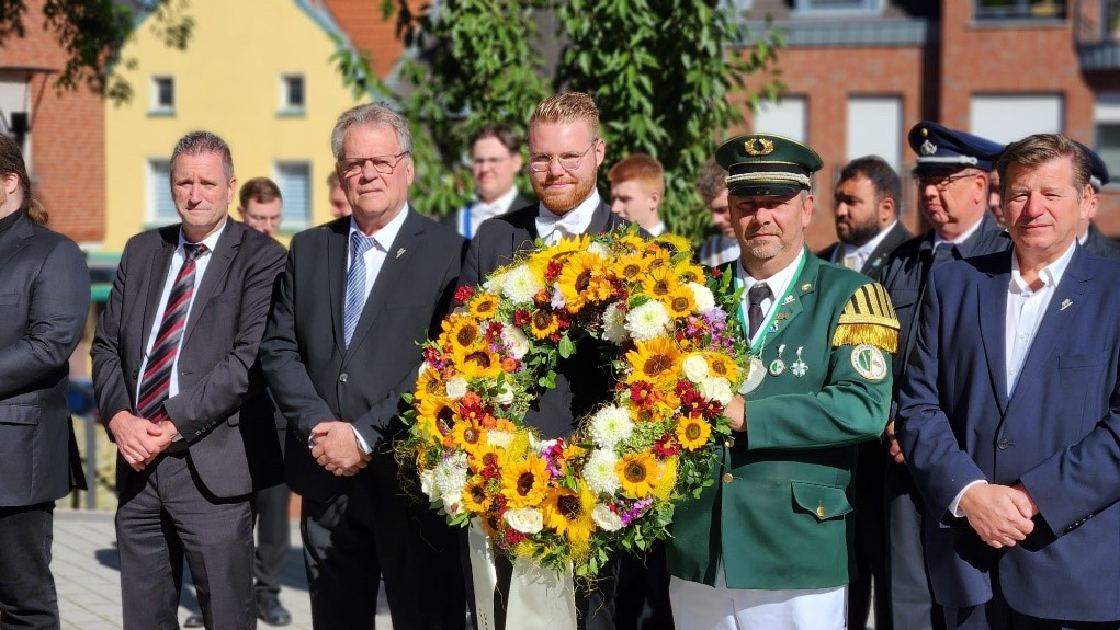 Gemeinsam mit der Pfarrei St. Marien Baesweiler, Pfarrer Dr. Dennis Rokitta und zahlreichen Vertreterinnen und Vertretern der Baesweiler Vereine sowie vielen Privatpersonen hat Bürgermeister Pierre Froesch am „Denkmal zur Erinnerung der Gefallenen“ an der Kirche St. Petrus in Baesweiler der Opfer von Gewalt, Krieg, Diktatur und Vertreibung gedacht. Organisiert wurde die Veranstaltung von der Interessengemeinschaft der Ortsvereine Baesweiler.