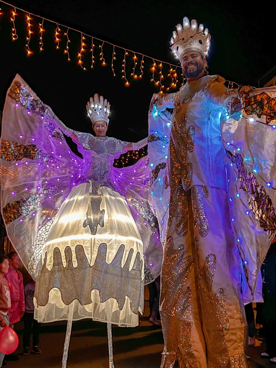 Eins der Highlights von „CityLights“ waren die lichtdurchfluteten „Nachtschwärmer“ vom Stelzentheater CIRCOLO als Walking Act, die in Bereichen der Innenstadt eine Magie nach Baesweiler brachten, auf den Stelzen tanzten und mit den Besucherinnen und Besuchern interagierten.