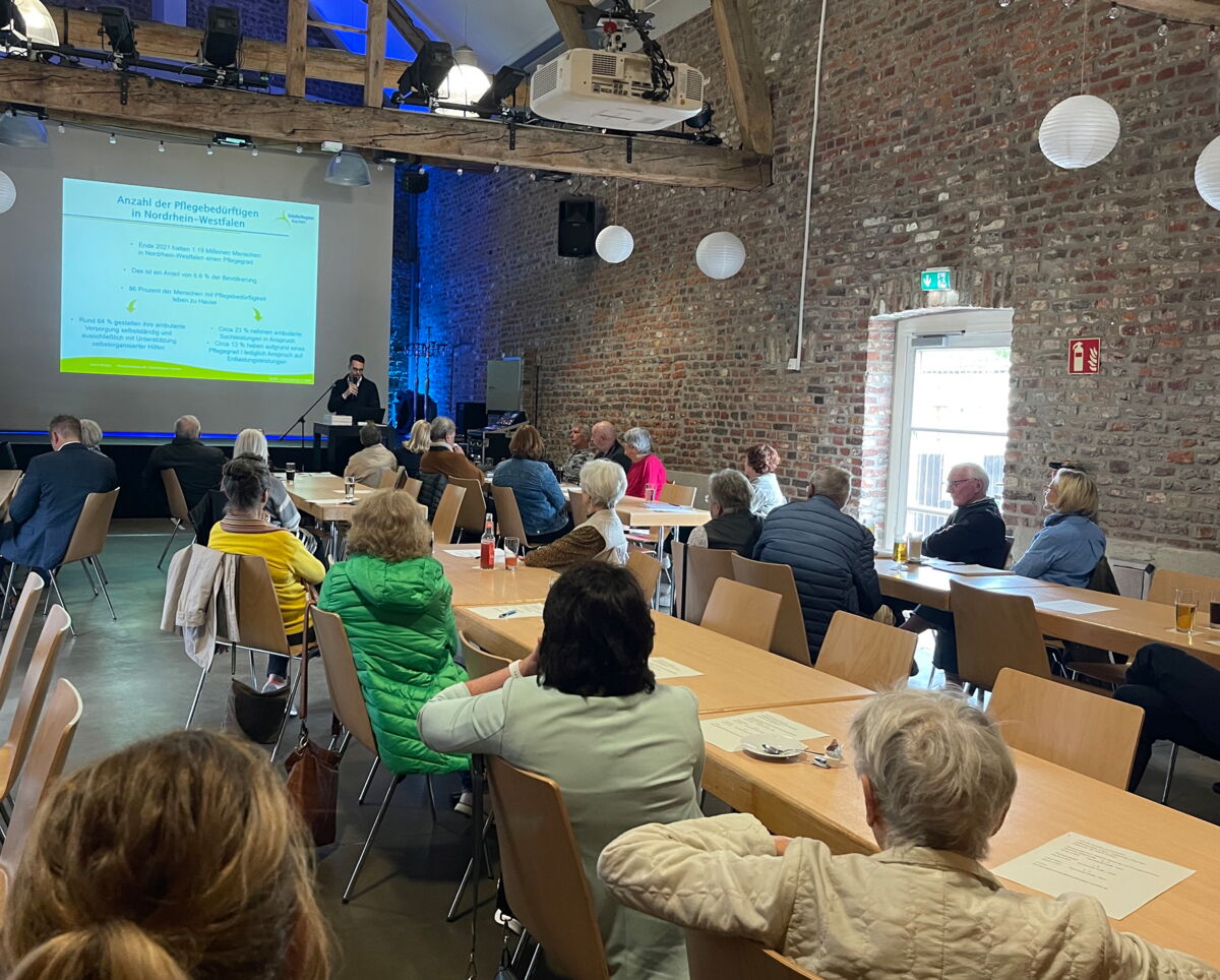 Zu Beginn des Seniorenforums stellte David Böttger von der StädteRegion Aachen die Pflegeberatung der StädteRegion Aachen vor und hielt einen Vortrag über die verschiedenen ambulanten Unterstützungsangebote, Hilfsmittel und Wohnformen im Alter.