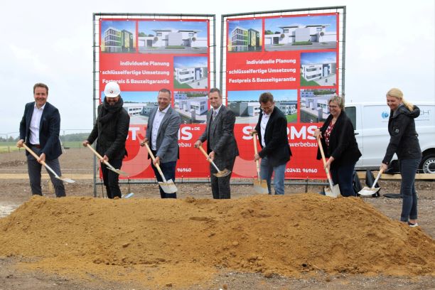 Foto v.l.: Hans Montag (Geschäftsführer Storms), Rainer Dohmen (Vertriebler Storms), Markus Beylich (Geschäftsführer Beylich), Bürgermeister Pierre Froesch, Dirk Pfeifferling (Geschäftsführer its), Technische Dezernentin Iris Tomczak-Pestel und Diana Schulte-Sperlich (Prokuristin Storms)