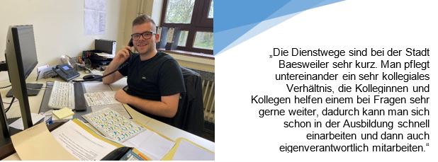 Luca Feldeisen hat im Rahmen der Ausbildung schon einige Zeit im Beitrags- und Umweltamt gearbeitet und verstärkt auch weiterhin das Team dort. Auch er freut sich, weiterhin bei der Verwaltung in Baesweiler zu arbeiten.