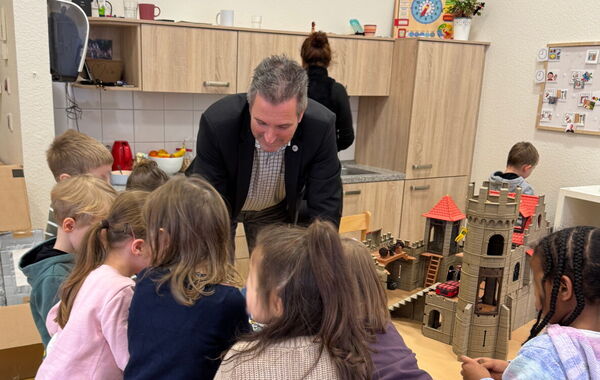 Bürgermeister Pierre Froesch ließ es sich nicht nehmen nach dem Umzug in die BürgerMItteBaesweiler, den „Nachbarskindern“ des Familienzentrums Sonnenschein „Hallo“ zu sagen. Mit einigen Süßigkeiten im Gepäck freute er sich, mit den Kindergartenkindern ins Gespräch zu kommen.