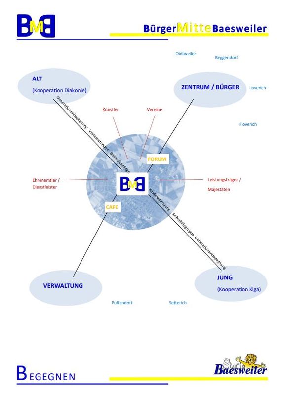 Der Standort der BürgerMitteBaesweiler ist so gewählt, dass eine Wechselwirkung mit ihrem Umfeld entsteht. Die BMB hat räumlich einen unmittelbaren Bezug zu der gegenüberliegenden Seniorenwohnanlage und dem benachbarten Familienzentrum, die hier stellvertretend für alle Generationen in Baesweiler stehen. Auf die so genannte Generationenbegegnung wurde im Zuge der Planung ein besonderes Augenmerk gerichtet. Menschen unterschiedlichen Alters aus dem gesamten Stadtgebiet sollen die BMB als Begegnungszentrum für alle Belange der Generationenbegegnung nutzen.