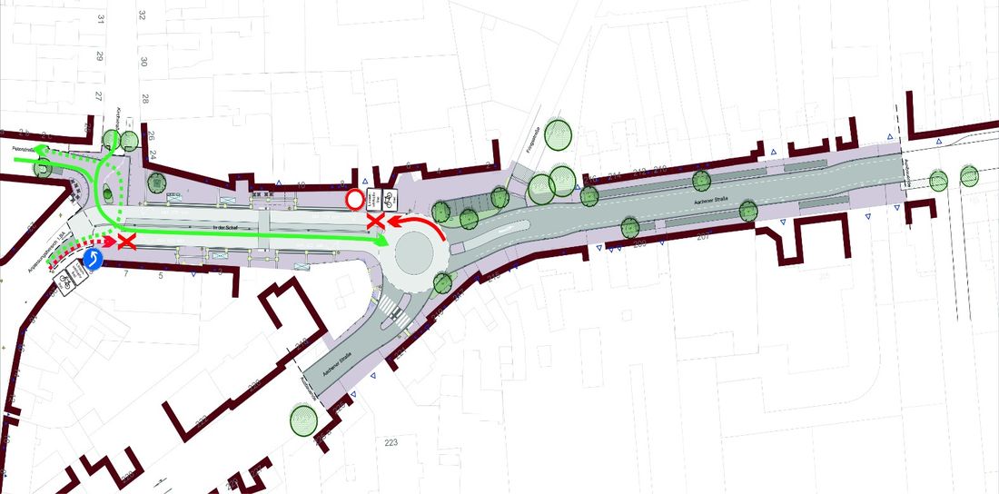 Auf Wunsch verschiedener Interessensvertretungen, z.B. aus dem Handel und der Feuerwehr, hat die Stadtverwaltung in vielen Gesprächen mit den zuständigen Fachbehörden und nur auf der Grundlage von Planungsnachweisen und Verkehrszählungen schließlich den Kompromiss erzielt, zumindest den Individualverkehr aus dem Ort heraus - von der Peterstraße und von der Kirchstraße aus Richtung der Innenstadt kommend - über die Straße In der Schaf zur Aachener Straße abfließen zu lassen. Schon diese reduzierten Verkehre hemmen den ÖPNV nachhaltig. Weitere Verkehrsströme zulasten des ÖPNV sind darüber hinaus nicht zulässig.