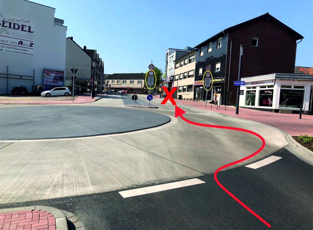PKW und LKW können jetzt nicht mehr von der Aachener Straße aus über den neuen Kreisverkehr in die Straße „In der Schaf“ einfahren (Beschilderung „Verbot der Durchfahrt“).