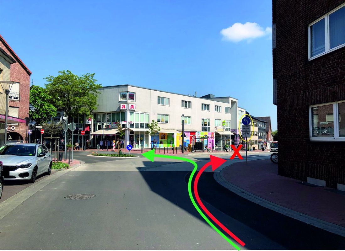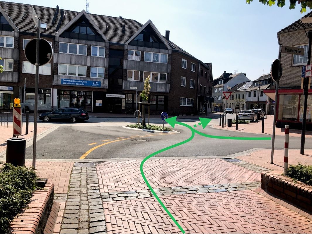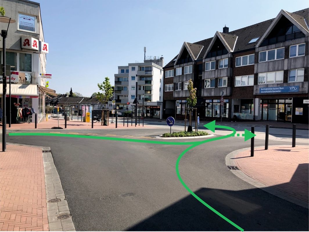 Aus der Kirchstraße (Innenstadt) kommend sowie aus Fahrtrichtung Peterstraße, kann weiter - wie gewohnt - in den ZOB („In der Schaf“) eingefahren werden. Auf diese Weise können die hier ansässigen Geschäfte, Arztpraxen und sonstige Dienstleistungsunternehmen weiterhin auch mit dem privaten Fahrzeug erreicht werden. Von der Peterstraße kommend kann darüber hinaus - wie vor der Umbaumaßnahme - nach rechts in die Kirchstraße (in Fahrtrichtung Oidtweiler) abgebogen werden. Eine Weiterfahrt von der oberen Kirchstraße (Innenstadt) in die untere Kirchstraße (Kreuzung Aachener Straße) ist ebenfalls weiterhin möglich.