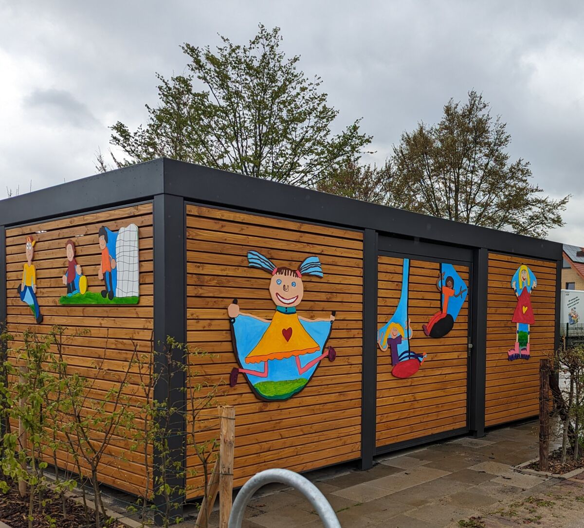 Als eine erste identitätsschaffende Maßnahme haben bereits in 2022 Schülerinnen und Schüler der Barbaraschule in Kooperation mit dem „Haus Setterich“, gefördert durch Mittel des Projektes „Soziale Stadt Setterich-Nord“, mit einem Künstler große Holzfiguren gestaltet, um später die Einhausung damit zu verzieren. Die Figuren wurden zunächst skizziert, auf Holz projiziert, ausgesägt und entsprechend bunt gestaltet.