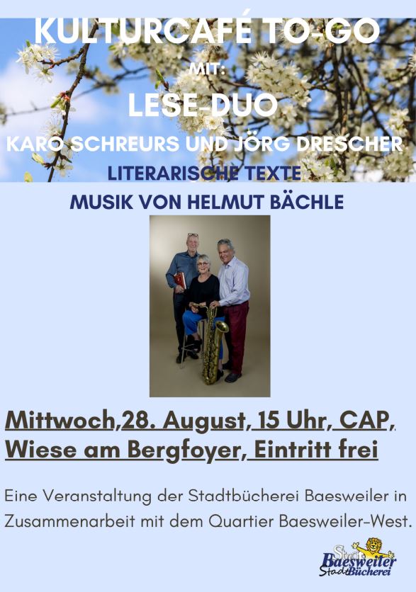 Das Lese-Duo Karo Schreurs und Jörg Drescher gehören mittlerweile fast schon traditionell zum Kulturcafé ToGo. Musikalisch untermalt wird das Ganze, wie schon im letzten Jahr, vom Saxophonisten Helmut Bächle.